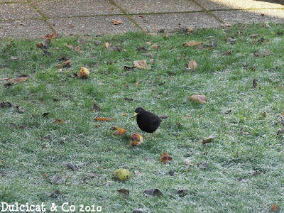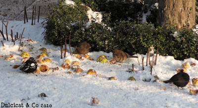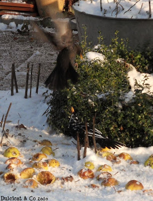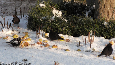 Nevou mais uma vez e encontrar comida é um desafio de todos os dias para os melros, estorninhos e outros pássaros.Para ajudá-los a sobreviver: maçãs, sementes e restos de comida como arroz, maça, pão etc. É um grande prazer para nós de contribuir as suas sobrevivências no inverno.